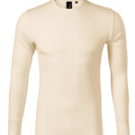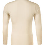 Single Jersey, 100% extrafinom merino gyapjú, gyűrődésmentes és magas légáteresztő-képességű anyag, hőszabályozó és antibakteriális tulajdonságok. Képes elvezetni a nedvességet és semlegesíteni a szagokat. Testhezálló szabás, oldalvarrással, keskeny nyakkivágás saját anyagával szegélyezve, hátsó nyakszegély belső oldala különböző anyagból, megerősített vállpánt, hosszú ujjú mandzsetta. Vízszintes helyzetben ajánlott szárítani.